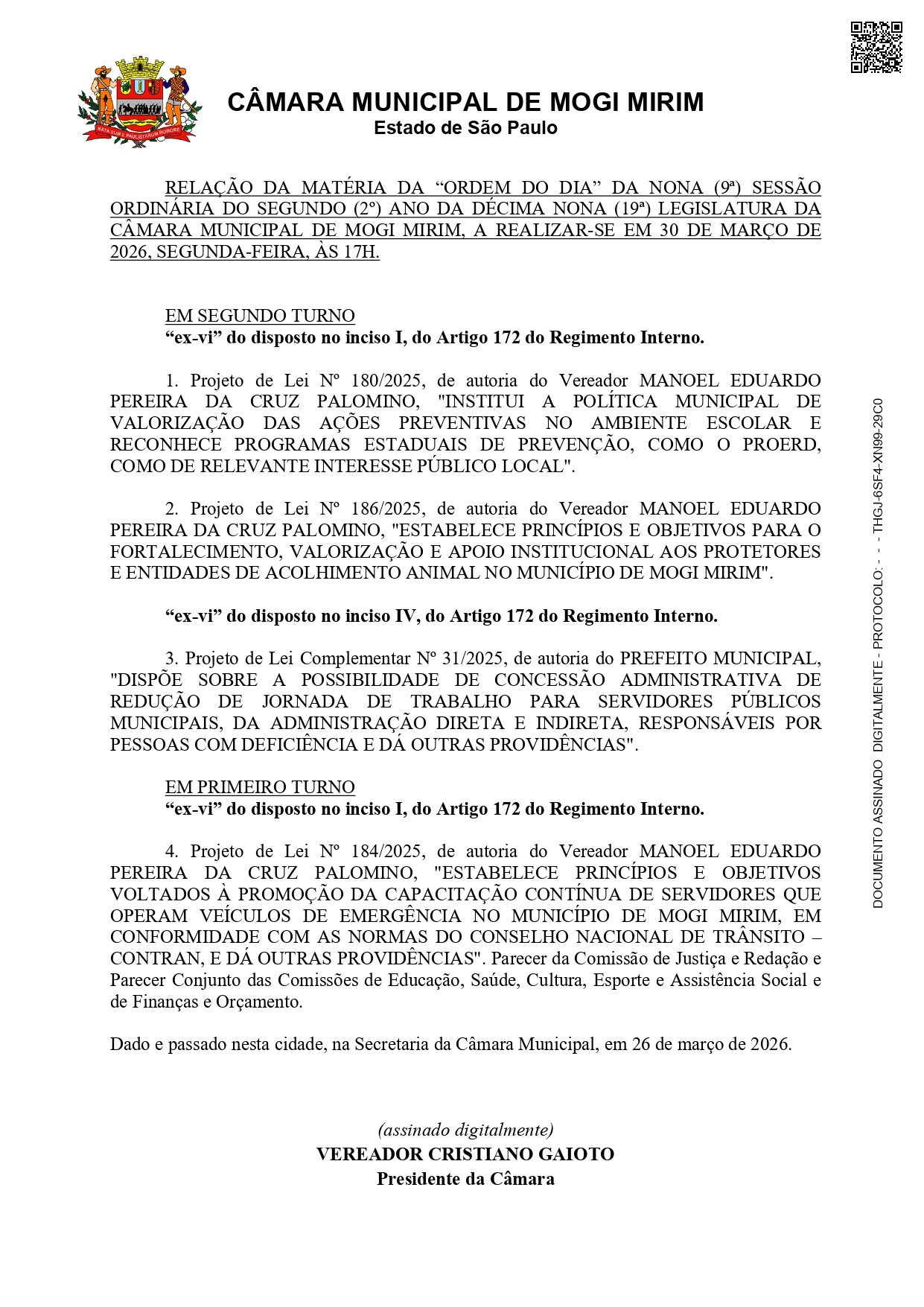 Na segunda-feira, dia 30 de março, a Câmara Municipal realizará a 9ª Sessão Ordinária de 2026. Veja abaixo a "Ordem do Dia" da sessão.