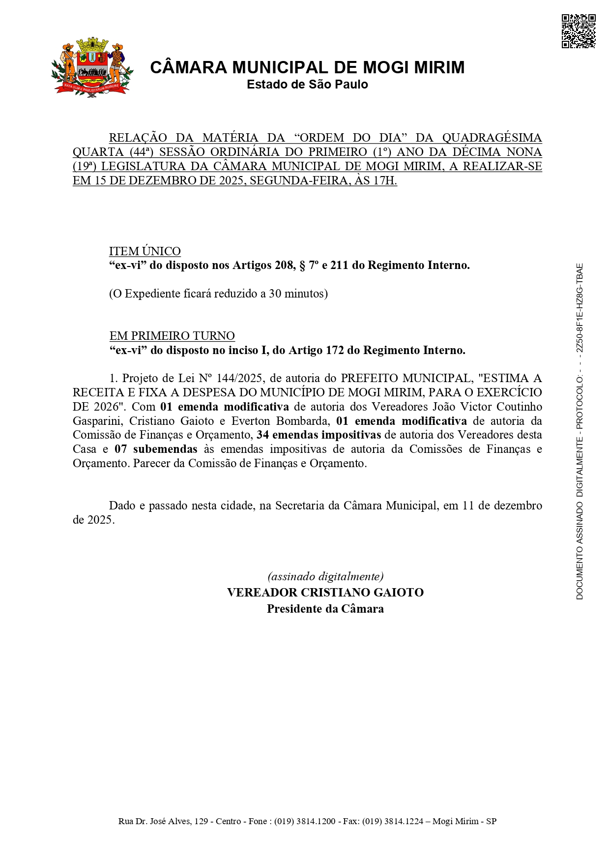 Na segunda-feira, dia 15 de dezembro, a Câmara Municipal realizará a 44ª Sessão Ordinária de 2025. Na "Ordem do Dia", os vereadores discutirão e votarão o Projeto da Lei Orçamentária Anual (LOA) de 2026, de autoria do Poder Executivo.